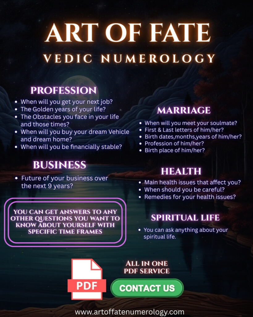 - If you’re ready for a thorough, time-framed numerology reading delivered as a professional PDF, Art of Fate is here to guide you. Reach out with your questions and let us illuminate the numbers that shape your destiny. Contact us on whatsapp.